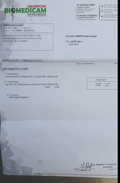 A negative HIV test purportedly belonging to Hervé Bopda is circulating online, but its dubious origin from a laboratory near his residence raises questions about its credibility. This contested document is unlikely to restore his reputation in the face of serious accusations against him.