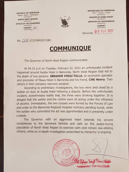 Mr Talla Ibrahim the owner of Mawa hotel located at mile 6 Nkwen in Bamenda and a sub-contractor for Eneo called Nche Harry popularly known as "Dangote" were killed today February 22 2022 at about 4:30PM inside the premises of Ayaba hotel in Bamenda by a Cameroonian soldier. The two business men were engaged in a heated argument with the said soldier who was drinking alcohol on the same table with them when the soldier opened fire killing them instantly. Onlookers say the soldier might have been drunk and strangely it is still unclear what they were arguing about, gendarmes stormed the area and ferried the said soldier to safety. We are getting unconfirmed reports that late Mr Talla Ibrahim was related to late Mr Djibril Dubila who was killed on Sunday July 4th, 2021 around the security check point at Below Foncha and accused by the Cameroonian govt of aiding and abetting secession.