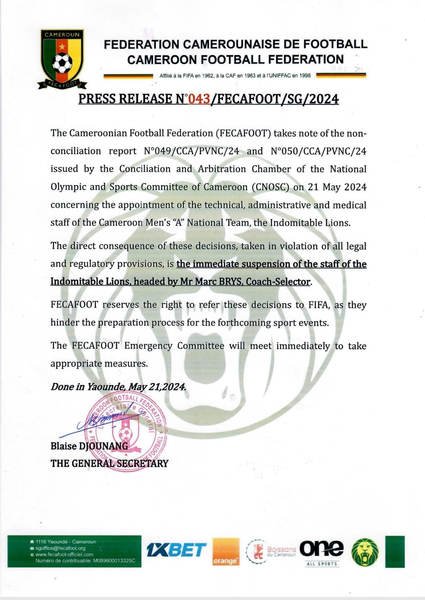 The crux of the controversy lies in the process of Brys' appointment, which FECAFOOT argues was executed unilaterally, bypassing necessary consultations and ignoring established legal and regulatory frameworks. The Conciliation and Arbitration Chamber of the National Olympic and Sports Committee of Cameroon (CNOSC) compounded the issue with non-conciliation reports (N°049/CCA/PVNC/24 and N°050/CCA/PVNC/24), highlighting procedural irregularities and exacerbating tensions between the involved parties.