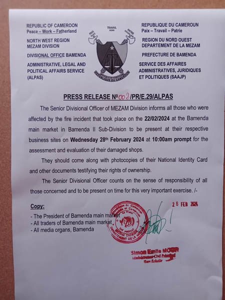 The press release, which was also addressed to the president of the Bamenda main market, all traders of the market, and all media organs, counts on the sense of responsibility of all those concerned and to be present on time for this very important exercise.