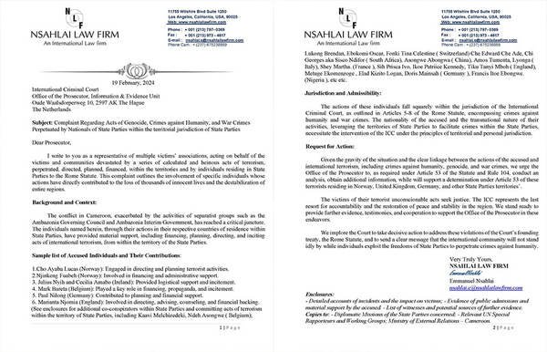 The complaint, filed on February 18, 2024, by NSAHLAI LAW FIRM, led by a Cameroonian-born lawyer, Emmanuel Nsahlai, seeks an investigation and prosecution of 16 individuals who are alleged to have orchestrated, funded, and directed a campaign of violence and terror against the civilian population in Cameroon, especially those who are loyal to the central government.
