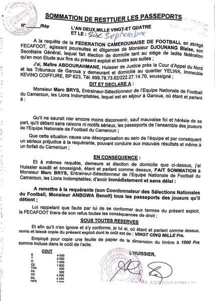 According to the legal summons issued by FECAFOOT and executed by Master Abdourahmane, a bailiff at the Court of Appeal of the North and the Courts of Garoua, Coach Brys has been formally ordered to surrender the passports of all players on the national team. FECAFOOT argues that Brys's refusal to comply has caused significant disorganization within the team, potentially jeopardizing their performance and even leading to a possible withdrawal from the competition.
